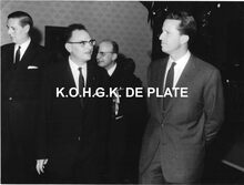 Formaat : 18 x 24 cm. - De koning en conservator Frank Edebau. Achter hen, Jan Piers en ThΓ©o Lefevre