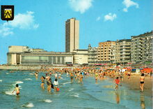Strandrecreatie op het Groot Strand. Rechts, de grote hotels langs de Zeedijk en op het einde de westgevel van de derde kursaal