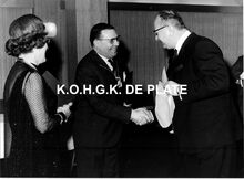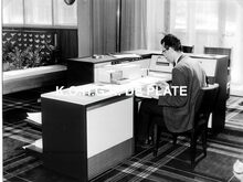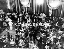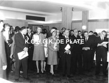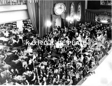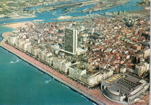 Van Mieghem/AVM. - We zien rechtsonder, detail van de ingang van de Wellingtonrenbaan gelegen langs de Koningin Astridlaan. Strandrecreatie op het groot strand. Het Thermae Palace en de Koninklijke gaanderijen langs de Zeedijk. Verder, de Nieuwe- en Venetiaanse gaanderijen en de Koninklijke villa langs de Albert I-promenade. De westelijke gevel van het Kursaal en het Europacentrum in de Van Iseghemlaan. In het midden de toren van het Feest- en Cultuurpaleis op het Wapenplein.