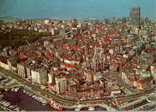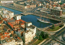 Van Miegem/AVM. - Oostende - Luchtfoto. Vue AΓ©rienne. Air-Photos. Luftbild. Het zeil- en schoolschip "Mercator, als museum in het tweede handelsdok of de Mercator jachthaven. De Vindictivelaan met het Onze-Lieve-Vrouwe College en het centrum van de stad met de Sint-Petrus- en -Pauluskerk en de Peperbusse (Sint-Pieterstoren). Een mooi zicht van de havengeul met het West- en Ooststaketsel en een carferry van de Oostende-Doverlijn die de haven uitvaart. Rechts, het Montgomerydok langs de Visserskaai en het gebouw van het Loodswezen langs de Sir Winston Churchillkaai. Rechts boven, de Oosteroever en de toegang tot de vissershaven.