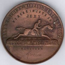 Op de keerzijde : rondom boven GRAND CONCOURS HIPPIQUE INTERNATIONAL, centraal rondom boven REMERCIMENTS AU, horizontaal JURY, in het midden een paard met ruiter in galop, eronder horizontaal op lint HIPPODROME WELLINGTON en daaronder MONSIEUR / MARION
