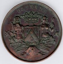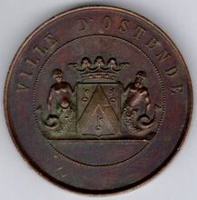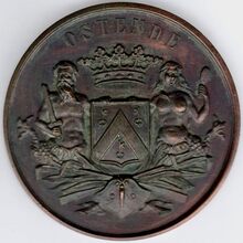 Op de voorzijde : centraal h het gekroonde wapenschild met keper en drie sleutels van de stad Oostende, geflankeerd door twee schildhouders, links meerman met zwaard naar links kijkend, rechts meermin met handspiegel naar rechts kijkend, alles geplaatst op palmbladeren samengebonden met een lint, rondom boven OSTENDE