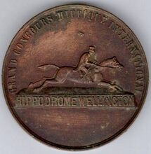 Op de keerzijde : rondom boven GRAND CONCOURS HIPPIQUE INTERNATIONAL, centraal een paard met ruiter in galop, er onder horizontaal op lint HIPPODROME WELLINGTON