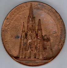 Op de keerzijde : horizontaal UNE EGLISE SERA ERIGEE / EN COMMEMORATION DE / SA MAJESTE LA REINE LOUISE / EN LA COMMUNE DE LAEKEN / ARRETE ROYAL DU 14 OCT 1850 / V. TESCH MIN. DE LA JUSTICE ET CH. ROGIER MIN. DE LβINT / LE PRODUIT DE LA SOUSCRIPTION NATIONAL / SERA AFFECTE A LA CONSTRUCTION / DE LβEGLISE DE LAEKEN / MONUMENT NATIONAL ELEVE A LA MEMOIRE DE LA REINE / DECISION DES DELEGUES DES PROVINCES DU 21 OCT 1850 / LE GOUVERNEMENT INTERVIENT DANS LES FRAIS / DE LA CONSTRUCTION DU MONUMENT / LOI DU 21 JUIN 1855 / F. PIERCOT MIN. DE LβINTERIEUR. CH. FALDER MIN. DE LA JUSTICE / LE 27 MAI 1854 SOUS LE REGNE DE LEOPOLD I / CH. FALDER MINISTRE DE LA JUSTICE / F. PIERCOT MINISTRE DE LβINTERIEUR / P. ANNEMANS GOUV. TEMPOR. DU BRABANT / CH.J. HERRY BOURGMESTRE DE LAEKEN / J.B. TORFS DESSERVANT / LA PREMIERE PIERRE DE LβEGLISE / BENISE PAR ENG. STERCKX / CARD. ARCHEV. DE MALINE / ET POSE PAR LE ROI