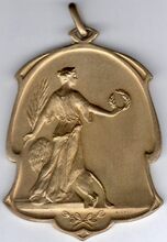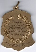 Op de keerzijde : rondom links een lauriertak, rechts een eikentak onderaan samen gestrikt, centraal horizontaal in sierletters SOUVENIR / COUPE SPONTON / ORANISEE PAR / βLES CARABINIERSβ / 26.DEC.1926, rondom onder in sierletters FLOBERT CLUB DU LITTORAL