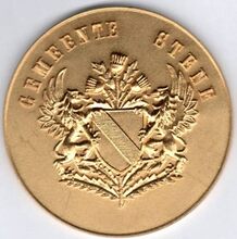 De prijspenning is rond van met gladde geprofileerde rand, bol en ring en is als volgt ingegraveerd