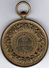 Op de keerzijde : rondom lauwerkrans van bloemen en noten, centraal in een binnen cirkel rondom boven VLAAMSCHE BROEDERS, rondom onder 1891, centraal horizontaal βΏ / OOSTENDE / βΏ