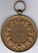 Op de keerzijde : rondom links een eiken tak en rechts een lauriertak onderaan samen gestrikt, centraal in een binnen cirkel rondom buiten STOET DER VISSCHERS, rondom binnen UITREIKING DER PREMIEN, horizontaal 1902, horizontaal onder βΏ ? βΏ