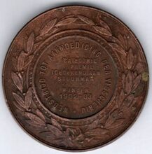 Op de keerzijde : rondom links een eikentak en rechts een lauriertak onderaan samen gestrikt, centraal rondom boven HET GEMEENTEBESTUUR, horizontaal VAN OOSTENDE / AAN DE ECHTEGENOOTEN / JOANNES FRANCISCUS ANTONIUS ARDAEN / EN / ELISABETH JACOBA JANSSENS / TER GELEGENHEID HUNNER / DIAMANTEN BRUILOFT / 10 OCTOBER / 1844-29 MEI-1904