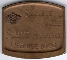 Op de keerzijde : linksboven een kroon, van boven naar onder SOCIETE / ROYALE / SAINT HUBERT / OSTENDE 1909