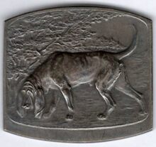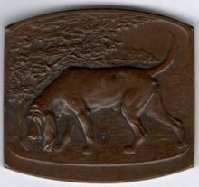 Op de voorzijde : op de voorgrond een snuffelende Sint-Hubertushond, in de achtergrond links een boom