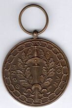 Op de voorzijde : rondom een keten, centraal wordt een zwaard afgebeeld met links een lauriertak, hiernaast links rondom F.N.P.G. (FΓ©dΓ©ration Nationale des Prisonnier de Guerre) en rechts een eikentak hiernaast rechts N.V.O.K. (Nationaal Verbond der Oud Krijgsgevangenen), de takken zijn onderaan samen gestrikt met een lint.
