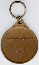 De gedenkpenning is onregelmatig van vorm met gladde geprofileerde rand met oog en ring, en is als volgt ingegraveerd :