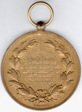 Op de keerzijde : rondom twee lauriertakken onderaan samen gestrikt, centraal rondom boven LA VILLE DβOSTENDE, horizontaal A / MR. EMILE DE VLIEGHER / 1e PRIX DE VIOLONCELLE / AVEC LA PLUS GRANDE DISTINCTION / AU CONCERVATOIRE ROYAL / DE BRUXELLES / CONCOURS 1904, rondom onder HOMMAGE, gesigneerd midden onder de strik C. WURDEN