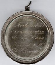 Op de voorzijde : rondom boven ECOLE DβARCHITECTUUR ET DE DESSIN, centraal het gekroonde schild, met keper en drie sleutels van de stad Oostende, onder het schild twee lauriertakken onderaan gekruist, onder horizontaal OSTENDE / 1835