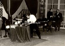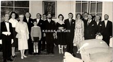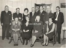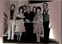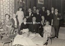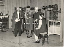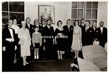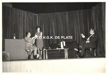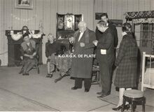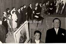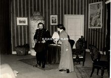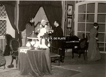 Formaat : 11,5 x 17 cm. - De toneelspelers van het Conservatoriumtoneel in het toneelstuk "Topaze" en viering van prof. Rikke Schmitz in de Koninklijke Schouwburg op 30/11/1958. Mevrouw Van Vlaenderen sprak als oudste leerling van het Conservatoriumtoneel.