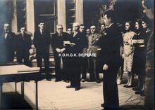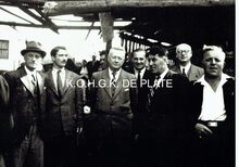 Vergroting. - Formaat : 30 x 40 cm. - V.l.n.r. Schepen Henri Edebau (met hoed), schepen Roger De Kinder, schepen Emiel Vroome, ? , Richard Panesi, Stadssecretaris Michel Surmont, ? , ?.