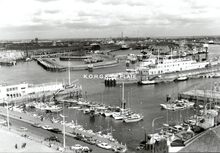 Formaat : 30 x 40 cm. - In de achtergrond, links het klein strand, een pakketboot in de havengeul en rechts het gebouw van de North Sea Yacht Club. Vooraan de standplaats van de visvrouwen met hun viskar beladen met vis en garnalen om te verkopen