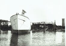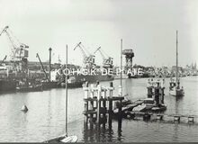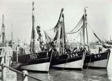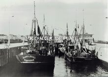 Vergroting. - 21,5 x 30,5 cm. - De 0.242 "Jeanne Maria", de O.127 "Basile Georges" en daarvoor nog twee vissersvaartuigen in de Visserijsluis