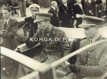 Vergroting. - Formaat : 30 x 39,5 cm. - Prins Karel, regent van BelgiΓ« was aanwezig op de militaire plechtigheid naar aanleiding van de overhandiging van het vaandel aan de Zeemacht en de uitreiking van eretekens. Het begin van de plechtigheid greep plaats op het Wapenplein. Er stond ook een tribune opgesteld aan de ingang van de Koninklijke Schouwburg in de Van Iseghemlaan, waar de prins en zijn genodigden het defilΓ© van de troepen volgden. (onder voorbehoud : hier in aanwezigheid van zijn vleugeladjudant kolonel Van Nerom)