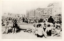 Links : afbeelding Sint-Petrus- en -Pauluskerk met op de voorgrond het oorlogsmonument ; Rechts boven : Groot Strand gezien vanaf Mariakerke ; Midden : een pakketboot ; onder : Strandrecreatie op het Groot Strand