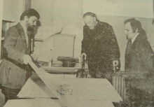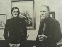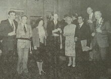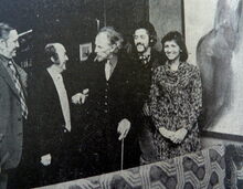 De tentoonstelling van Guynelly (Maes Jean-Pierre) in Gallery Drakkar kreeg het bezoek van prins Karel. Uiterst rechts, de kunstenaar en zijn echtgenote. De prins in gesprek met Vic Van Geel en uiterst links, Roland Struys, kunstcriticus