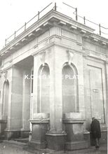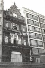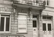 Formaat : 8 x 12 cm. - Schilddragende leeuwen uit zandsteen aan de zuidkant van de Koninklijke Gaanderijen. Geplaatst in 1916-1917, een tien jaar na de bouw van de Koninklijke Gaanderijen. Ze zijn het werk van de beeldhouwers Prosper Baeys en Georges Petit. Zie artikel van Norbert Hostyn in De Plate van januari 1984, p.7-8