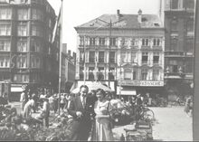 Formaat : 10,5 x 15 cm. - Bloemenmarkt op het Wapenplein met zicht op de Sint-Sebastiaanstraat (rechtdoor). Op de hoek rechts een tearoom, rechts daarvan tabakszaak Eymael en Cie, dan een patisserie en dan het gebouw van de Bank van Brussel