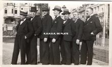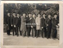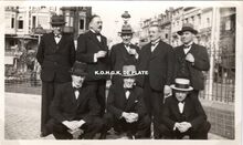 Formaat : 6 x 10,5 cm. - Groep croupiers in feestkledij in de tuin van het kursaal. In de achtergrond de Van Iseghemlaan