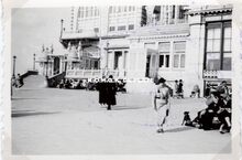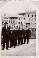 Formaat : 6 x 10;5 cm. - Croupiers in feestkledij in de voortuin van het kursaal met in de achtergrond de Van Iseghemlaan.