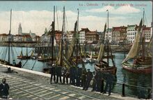Marco, 6 A. - Ostende - Port des pΓͺcheurs de crevettes. - Bijgekleurde kaart. - Vissers poseren waar nu de Sir Winston Churchillkaai is. Vooraan, de treinsporen die leiden naar de Oude Vismijn (de Cirk), waar de vistreinen vertrokken. In het Schuildok liggen Oostendse schovers en éénmast zeilvissersvaartuigen. Op de achtergrond, de Visserskaai