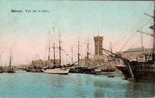 Ostende - Vue sur la Gare. - Bijgekleurde kaart. - Zeilschepen in het tweede handelsdok. Rechts, gedeelte van het tweede spoorwegstation (Oostende-Stad) gelegen langs de Keizerskaai.