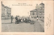 Sur la Digue : Raccommodage des Filets de PΓͺche. - Rechts, het gebouw van de Bestendige Reddingsdienst. Links, het "Hotel de l'Estacade"