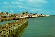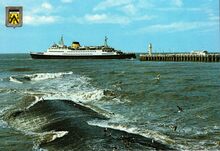Oostende - Ferrybootkaai. Quai de paquebot. FΓ€hrbootskai. Ferryboat-quay. - Pakketboten van de Oostende Dover lijn aan de kaai nabij het Zeestation. Links, in het centrum, de torens van de Sint Petrus en Pauluskerk en toren van het Feest- en Cultuurpaleis op het Wapenplein