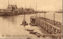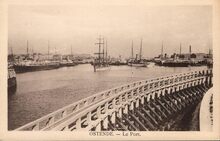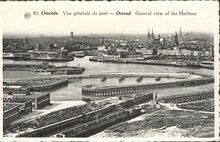 Albert, NΒ° 80.Phototypie A. Dohmen, Bruxelles. - Ostende - Vue gΓ©nΓ©rale du port. Ostend - General view of the Harbour. - Panorama van de haven. Vooraan, de zeesluis die de verbinding is tussen het Visserijdok en de havengeul. Links, de Vismijn en wat hoger langs de havengeul, het geboouw van de bestendige reddingsdienst op de oosteroever. Rechts, de kuisbank en de havengeul en op de achtergrond het centrum van de stad, met o.a. links, een pakketboot van de Oostende - Doverlijn gemeerd nabij het Zeestation. In het midden de oude vismijn, genaamd de "Cirk" en rechts, het Schuildok langs de Visserskaai.. Oostende in het interbellum.