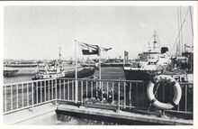 Mess. Driekroezen, Brugge. - Oostende - Vertrek van de Maalboot Koningin Elisabeth. - Ostende - DΓ©part de la Malle Reine Elisabeth. - Een vrachtschip van de Oostende Tilbury lijn vaart de haven binnen. De pakketboot "Koningin Elisabeth" klaar voor vertrek. Foto genomen van op de Royal North Sea Yacht Club