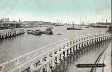 Photographie artistique Ed. Nels, Serie Ostende Delft, NΒ° 20. - Ostende - la station. - Gelegen langs de Keizerskaai en de Vandersweepplaats op de wijk Hazegras. Links, ook langs de Keizerskaai, de estaminets "De Koophandel" en "In 't Vuurschip". Het kleine witte gebouw is het eerste politiebureau op de wijk. Een jacht ligt gemeerd in het eerste handelsdok. Vooraan, de tram- en treinsporen van de Keizerskaai.