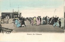 Ostende - ChΓ’let Royal. - De Zeedijk gezien vanaf het Koninklijk Chalet met op het einde de westgevel van de derde Kursaal. Links, het Groot Strand. De burgerij modieus gekleed in de Belle Epoque.
