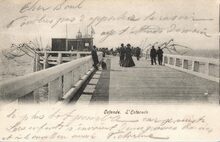 Ostende - L'Estacade. - Het einde van het Weststaketsel met het cafΓ©-paviljoen waar je op het terras kon genieten van de gezonde zeelucht. Met een kruisnet kon je proberen een krabbetje of visje te vangen. Oostende in de Belle-Epoque