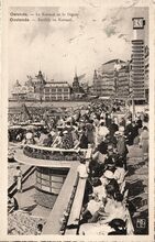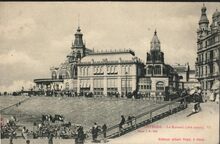 Editeur Albert Sugg. Γ Gand, SΓ©rie 7 N, 100. - Ostende - Le Kursaal (cΓ΄tΓ© ouest). VI. - De westgevel van de derde Kursaal langs de Zeedijk. Het plekje daarvoor wordt nog altijd "Petit Nice" genoemd, daar het beschutting biedt tegen de soms gure noordenwind. Links, op het Groot Strand, verkoopt een vrouw vlaggen, schopjes en emmertjes. Meer was er niet vΓ³Γ³r de Eerste Wereldoorlog om je als kind te amuseren.