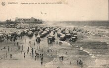 Nels. Ern. Thill, Simonisstraat, 20-22, Brussels. Reeks 13, NΒ° 31. - Oostende - Algemeen gezicht van het strand op het uur der baden. - Strandrecreatie op het Groot Strand. De traditionele badkarren die deel uitmaakten van het baden in zee. Op het einde het "Royal Palace Hotel". Vooraan, zijn toeristen aan het pootjebaden