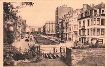 Edit. W.V.S., 183, Boulv. du Hainaut, Brux. - Ostende - Nouvelee Post. L'EntrΓ©e gΓ©nΓ©rale. - Het postgebouw, op de hoek van de Hendrik Serruyslaan (rechts) en de Wittenonnenstraat. Gebouwd naar de plannen van architect Charles De Wulf.