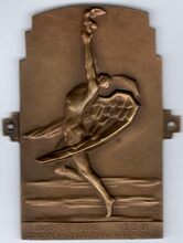 Op de voorzijde : centraal een man met vleugels, rennend langs de vloedlijn, naar boven reikend met een fakkel in de handen, onderaan horizontaal OSTENDE 1930 / CONCOURS DβELEGANCE DβAUTOMOBILE, rechtsonder gesigneerd ROBERT V.D. VELDE