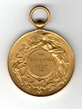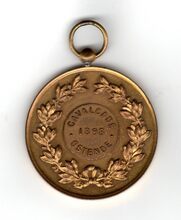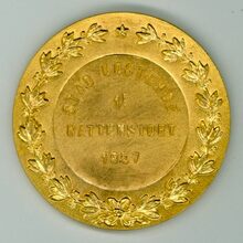 Op de keerzijde een open eikentak (rechts) en een lauriertak (links) beide onderaan samen gestrikt, midden onder gesigneerd A. FISCH, centraal in een medailllon GRAND / FESTIVAL / OUVERTURE / DE LA / SAISON DES BAINS / 1876