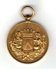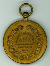 Op de keerzijde : rondom twee lauriertakken onderaan samen gestrikt, centraal in een medaillon rondom boven HARMONIE COMMUNAL, horizontaal EUTERPE / OSTENDE/ INAUGURATION DES / UNIFORMES / 1896