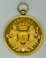 Op de voorzijde : rondom boven OSTENDE, centraal het gekroonde wapenschild met keper en drie sleutels van de stad Oostende, geflankeerd door twee schildhouders, links meerman met zwaard naar links kijkend, rechts meermin met handspiegel naar rechts kijkend, alles geplaatst op palmbladeren samengebonden met een lint, rondom onder gesigneerd A. DISPERSYN.