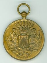 O de voorzijde : rondom boven OSTENDE, centraal het gekroonde wapenschild met keper en drie sleutels van de stad Oostende, geflankeerd door twee schildhouders, links meerman met zwaard naar links kijkend, rechts meermin met handspiegel naar rechts kijkend, alles geplaatst op palmbladeren samengebonden met een lint, rondom onder gesigneerd A. DISPERSYN