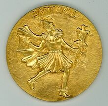 Op de keerzijde : rondom een vrouwenfiguur (muze van de muziek en het lied Euterpe) in lang gewaad en lange haren, in haar linkerhand een fluit en de rechterhand een palmtak, links een dansende engel, centraal in een medaillon horizontaal >< CARNAVAL / 1906 >< , rechtsonder gesigneerd ADW, onder de engel zeven ingeslagen rozen,