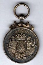 Op de voorzijde : rondom boven OSTENDEn centraal het gekroonde wapenschild met keper en drie sleutels van de stad Oostende, geflankeerd door twee stadshouders, links meerman met zwaard naar links kijkend, rechts meermin met handspiegel naar rechts kijkend, alles geplaatst op palmbladeren samengebonden met lint, onderaan gesigneerd R. DISPERSYN