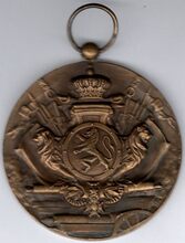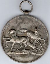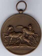 Op de keerzijde : links een palmtak, horizontaal VILLE / DβOSTENDE / CONCOURS / HIPPIQUE / INTERNATIONAL / 1901 / 8-9-10-11 / SEPTEMBER